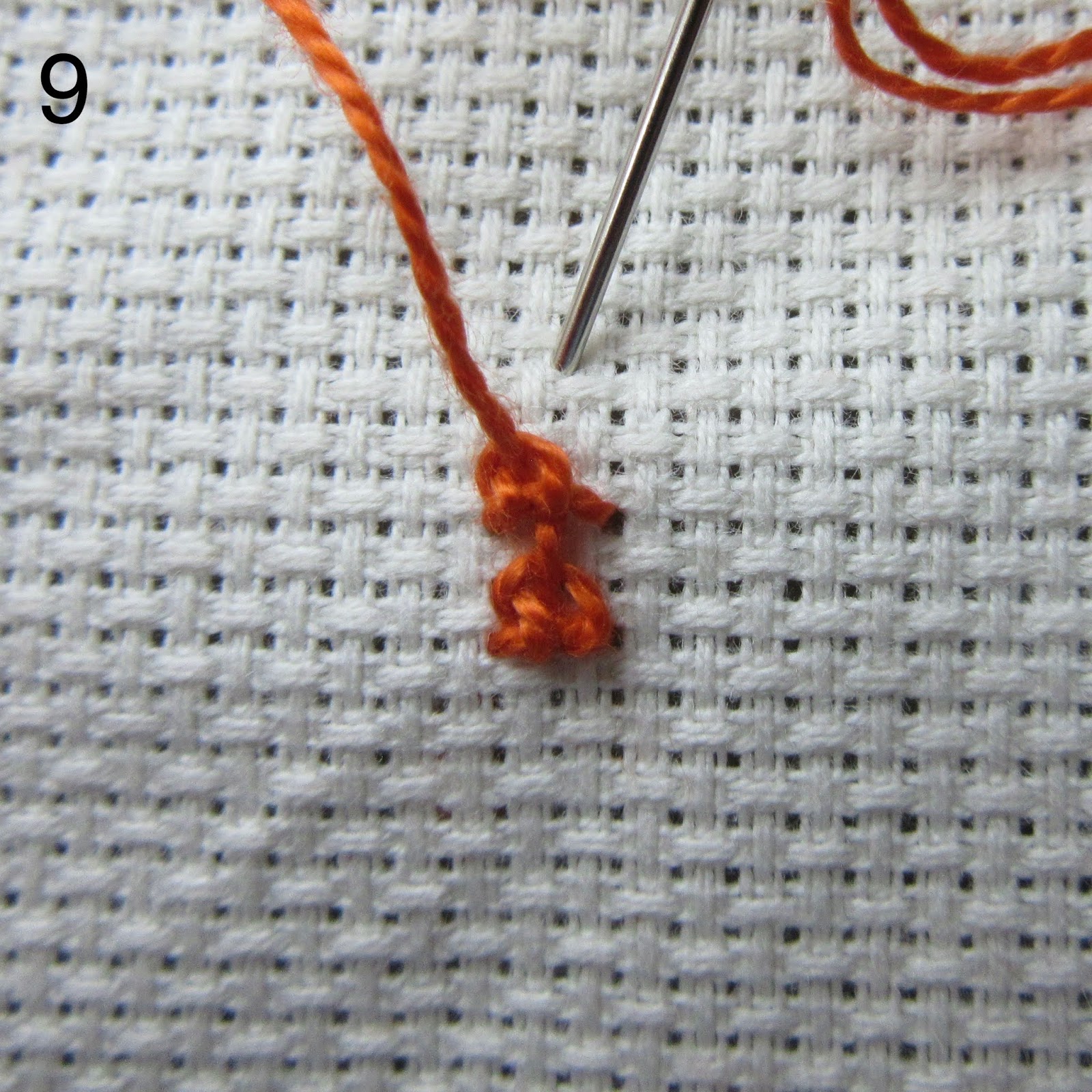 When worked in thick thread and large stitches it is easy to see that you have two legs to the left (up in the picture below) and one to the right (down in the picture).