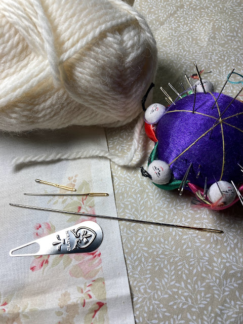 Apart from quilting needle and thread, you will need knitting yarn (preferably white, or the colour of the fabric), LONG blunt needles (for tunnels), or very short ones (for curves). In the picture is a set from Clover.